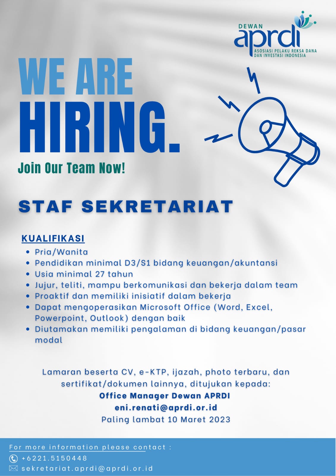 Lowongan Kerja Staff Sekretariat APRDI 28 February 2023 Admin Info, Karir APRDI sedang membuka lowongan pekerjaan untuk posisi sebagai Staff Sekretariat Share This Tweet Share Share Email Related Posts Lowongan pekerjaan posisi HR Admin & Operation. PT Panin Asset Management sedang membuka lowongan pekerjaan untuk posisi sebagai HR Admin & Operation.… Pengumuman Dewan APRDI terkait Ujian Sertifikasi WAPERD & WMI Lowongan kerja Posisi Equity Portfolio Manager PT BNP Paribas Asset Management sedang membuka lowongan pekerjaan untuk posisi sebagai Equity Portfolio Manager.…